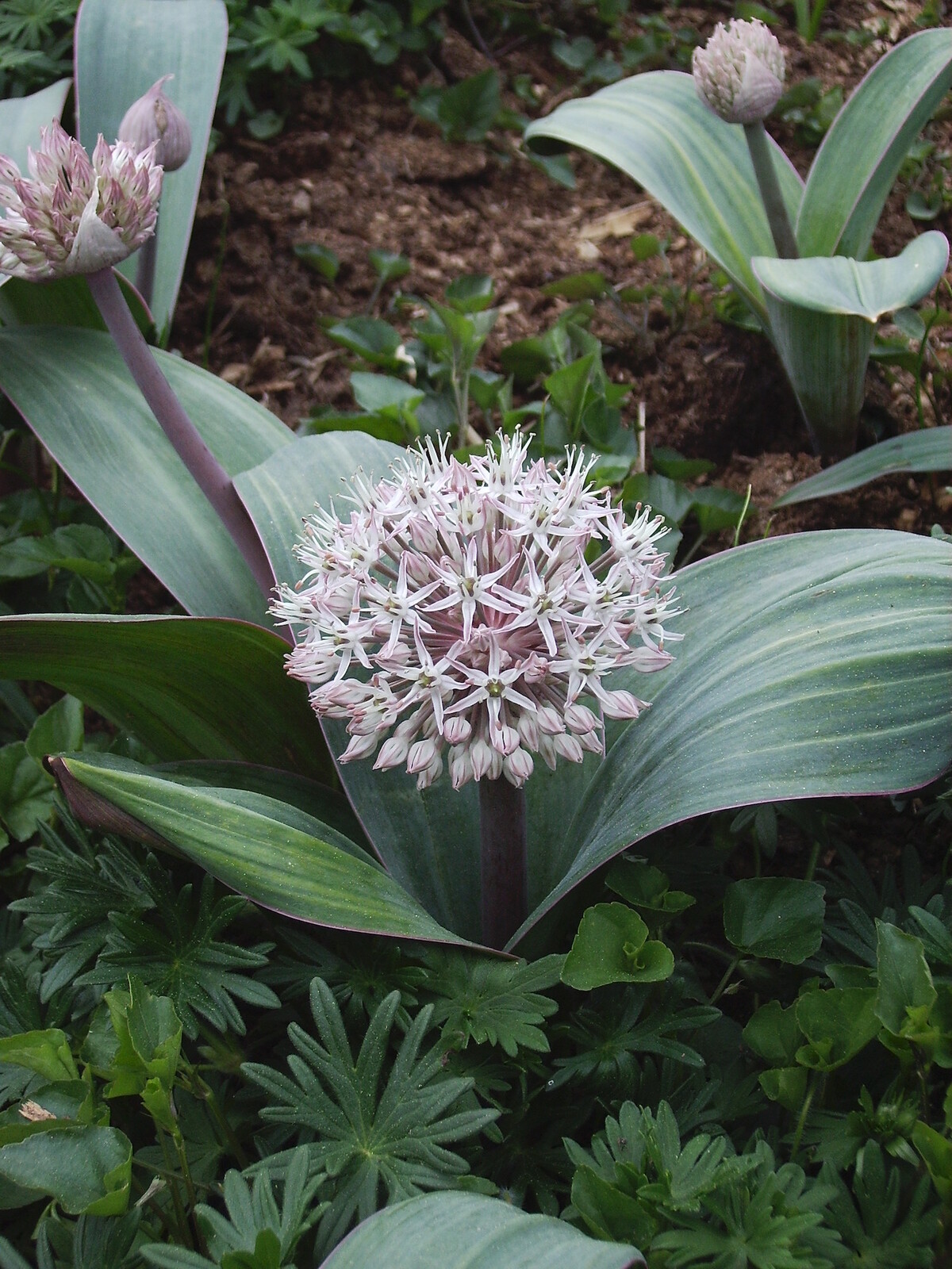 Usually two, dark, purplish-grey, wide curving leaves cradle a soft, pinky-beige flower head the size of an orange. Still effective in midsummer when it forms a good seed head. Best in groups.