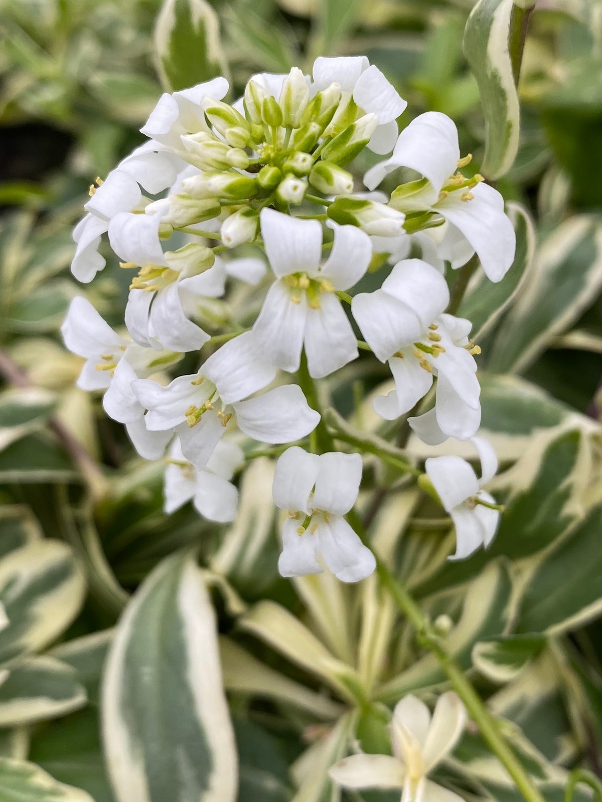 An individual plant. Forms tight rosettes of shining leaves. splashed more ivory, than green. Many sprays of white flowers.