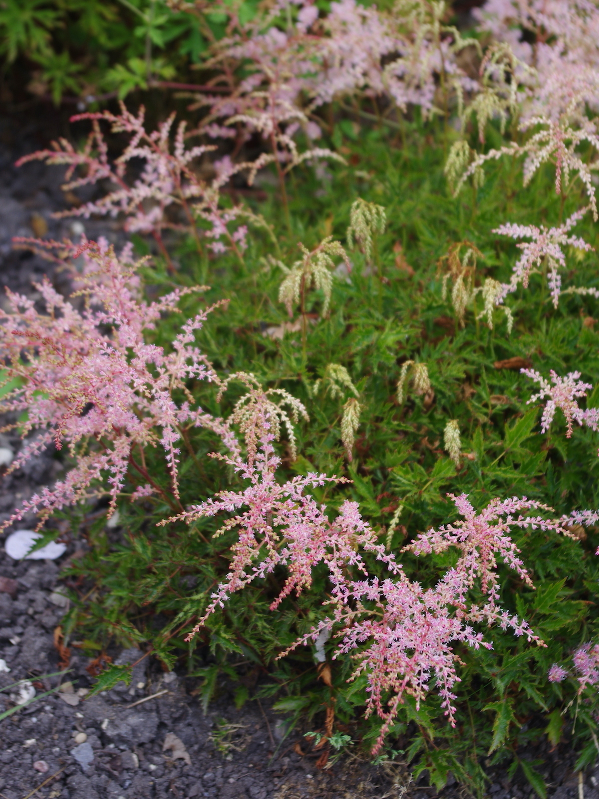 Much divided leaves, chocolate-bronze when young, slowly changing to a very dark green. Setting off the triangular sprays of pale pink, fluffy flowers. They last for weeks, imperceptibly deepening to chestnut and finally reddish-brown seed heads. Most welcome in the autumn border.