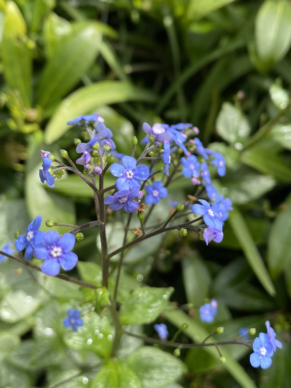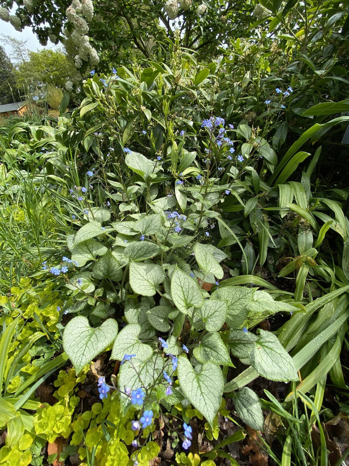 Heart-shaped leaves almost totally silvered, enhanced with a fine network of green veins and edged with a narrow green rim, form a setting for sprays of blue forget-me-not like flowers throughout spring and early summer. They are followed by new, much larger basal leaves which make dramatic contrast with green-leafed plants until autumn frosts if grown in part-shade and good soil.