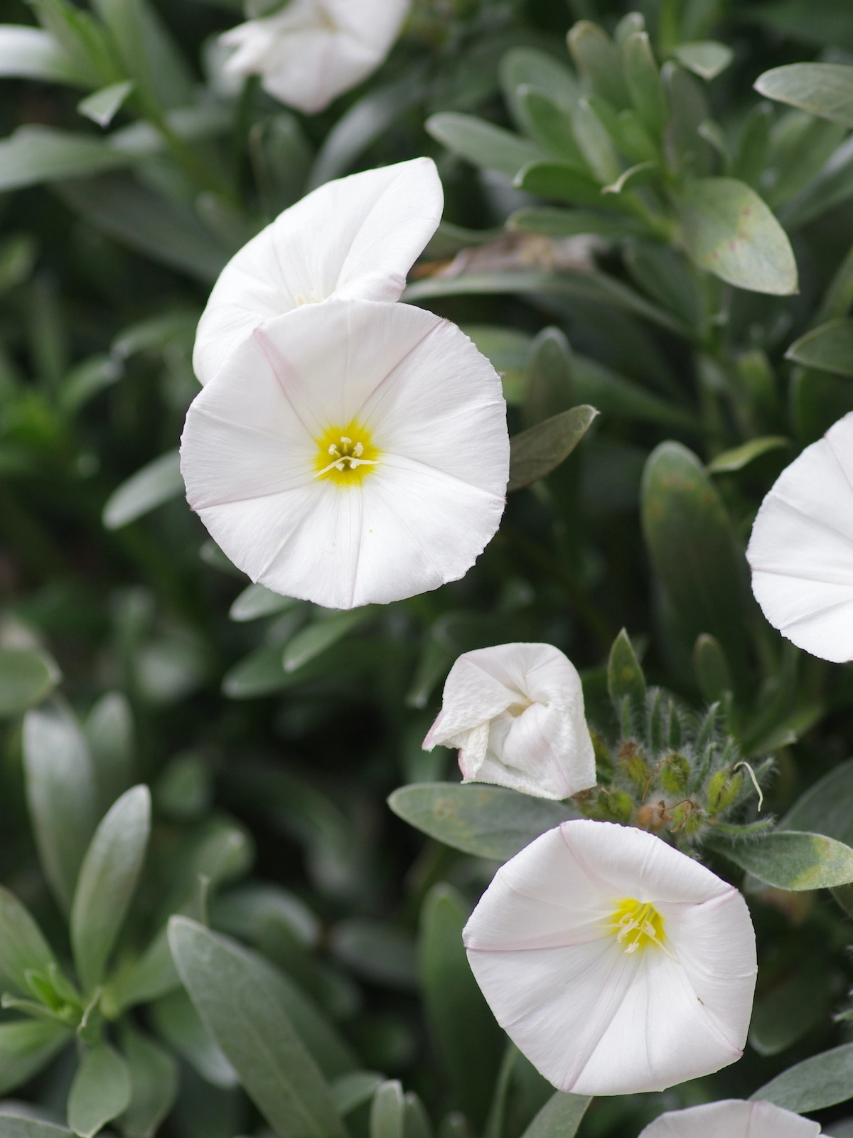 A treasure for a warm site in well-drained soil. Glistening small leaves, silky to touch, form a small neat shrub. Each tip holds clusters of long, narrow rose-coloured buds furled like umbrellas, which open fluted ivory-white yellow-eyed flowers for weeks in midsummer and again, a few in autumn. This plant must be given winter protection if required to be sent with autumn order.