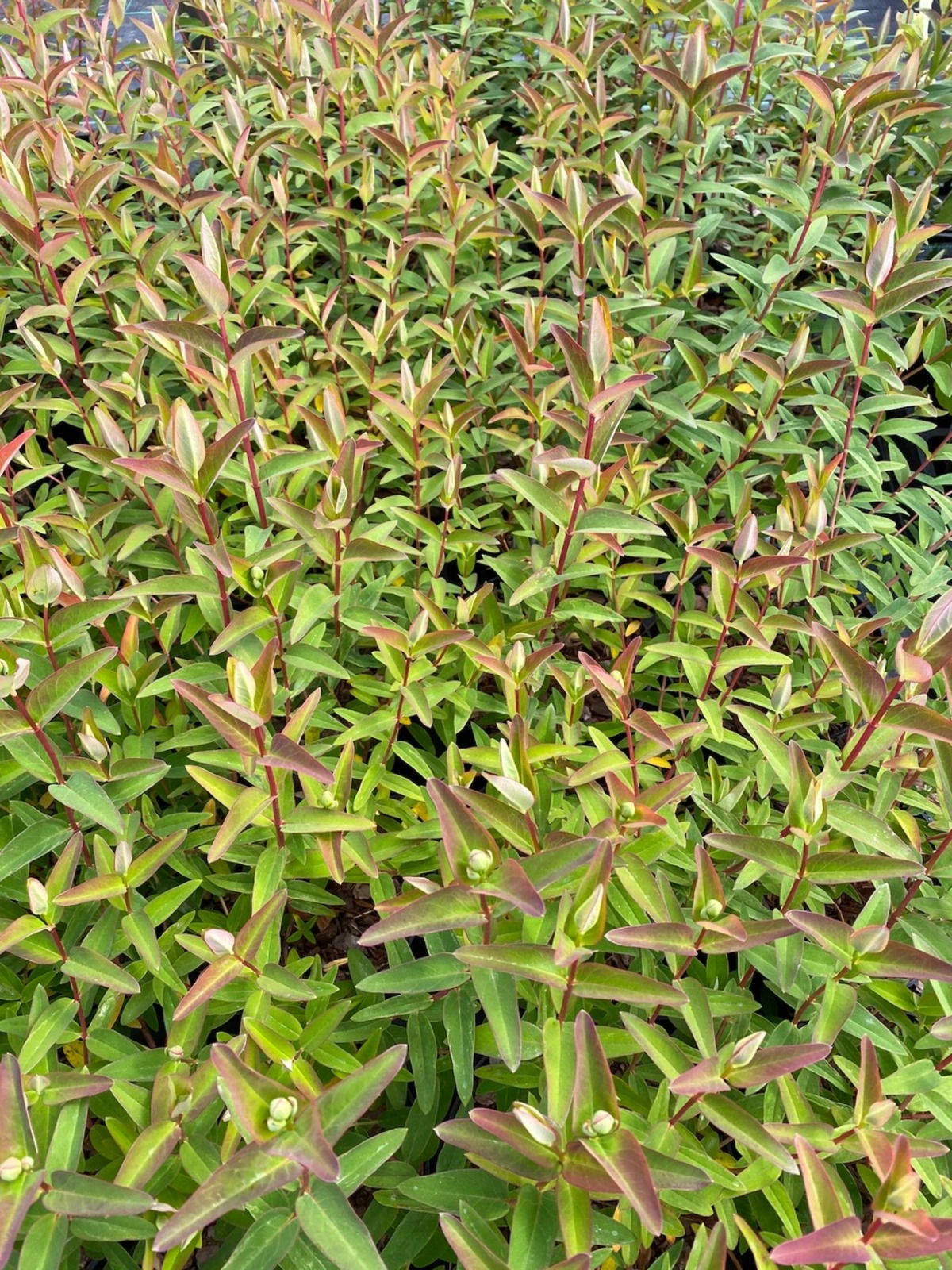 An upright shrub with aromatic dark green leaves. Clusters of star-shaped yellow flowers from mid-summer to mid-autumn followed by large fruit which flush pinkish red on ripening. Synonym Hypericum 'Hidcote'