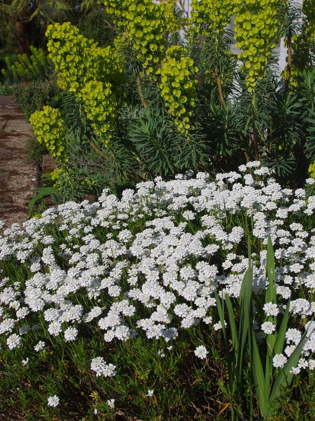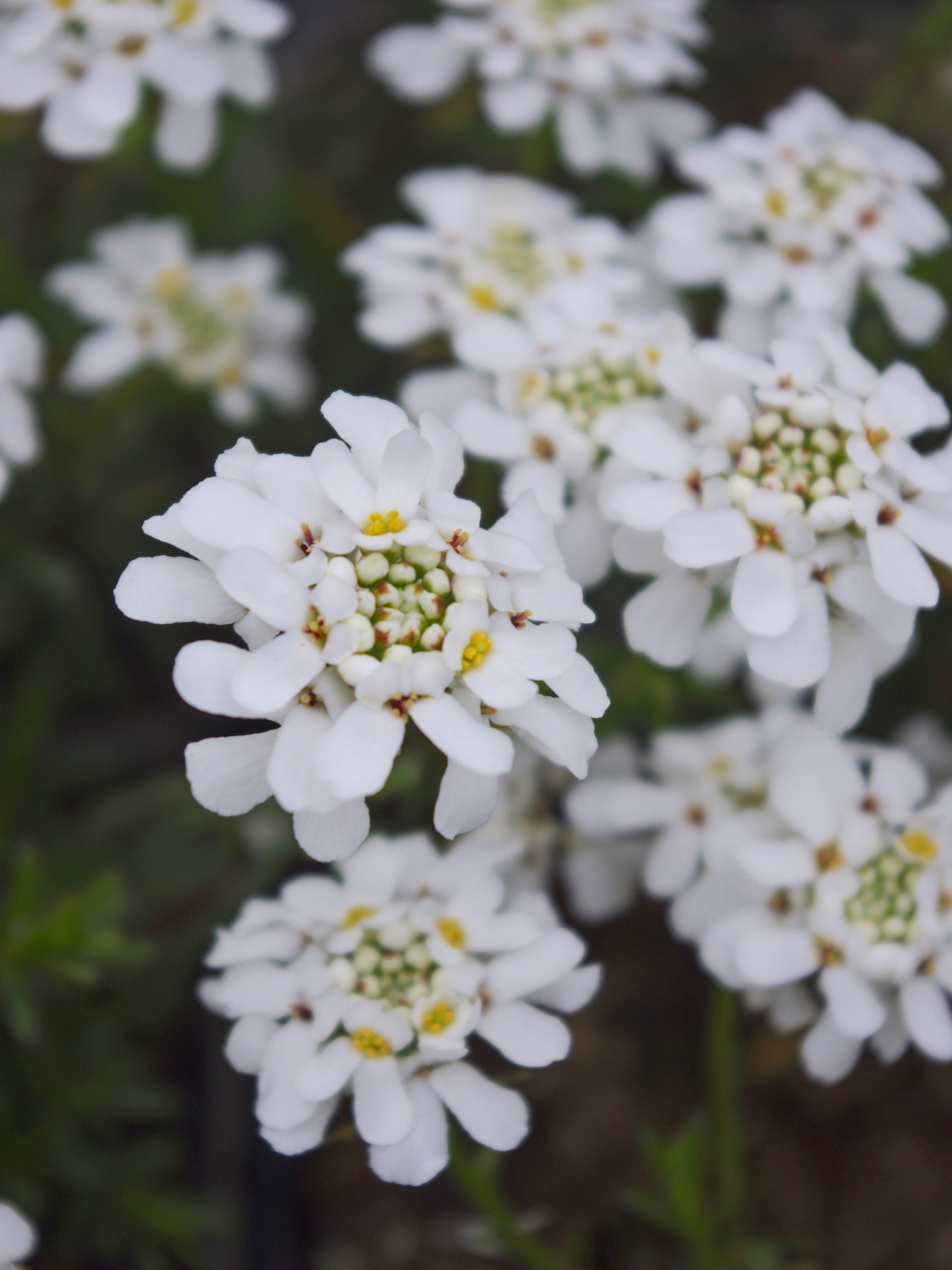 Draws attention in spring when its prostrate dark green mats are smothered with chalk-white candytuft flowers.