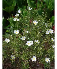A wide spreading low bush, whose twiggy branches are covered with neat dark evergreen leaves, smothered in medium-sized white flowers throughout summer. Needs a well-drained warm site.