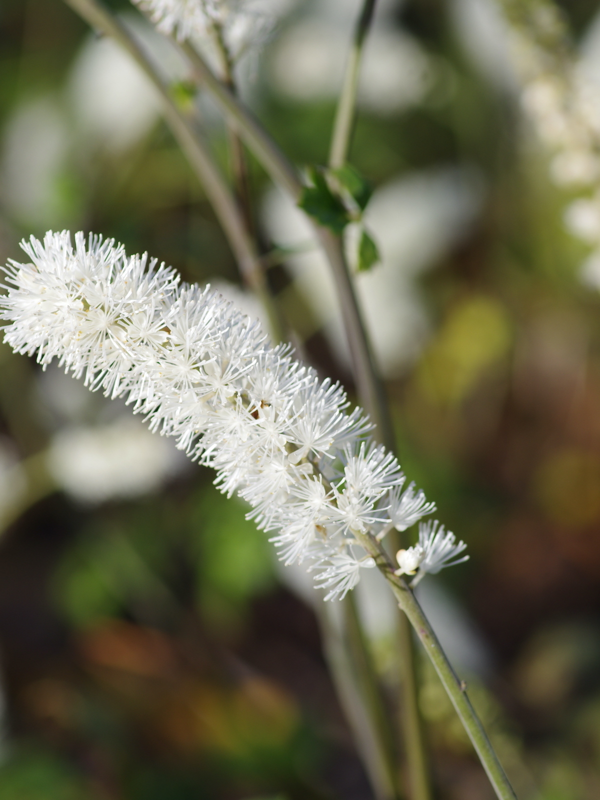 A floriferous form, with darker stems and glossy divided foliage. In autumn, often well into October, November, relatively long spikes of fluffy white flowers open from creamy buds.