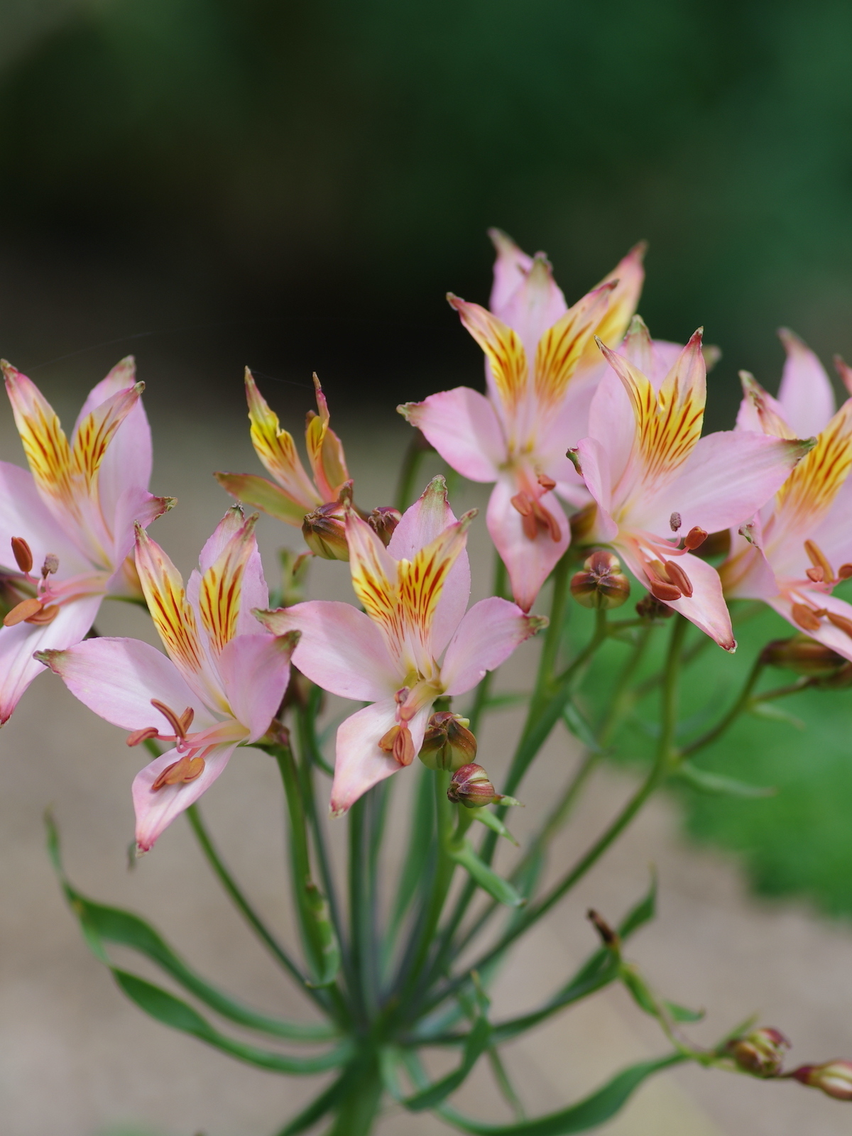Tall stems carry large heads of many small lily-like flowers exquisitely veined, in shades of pink to apricot. May cause skin allergy.