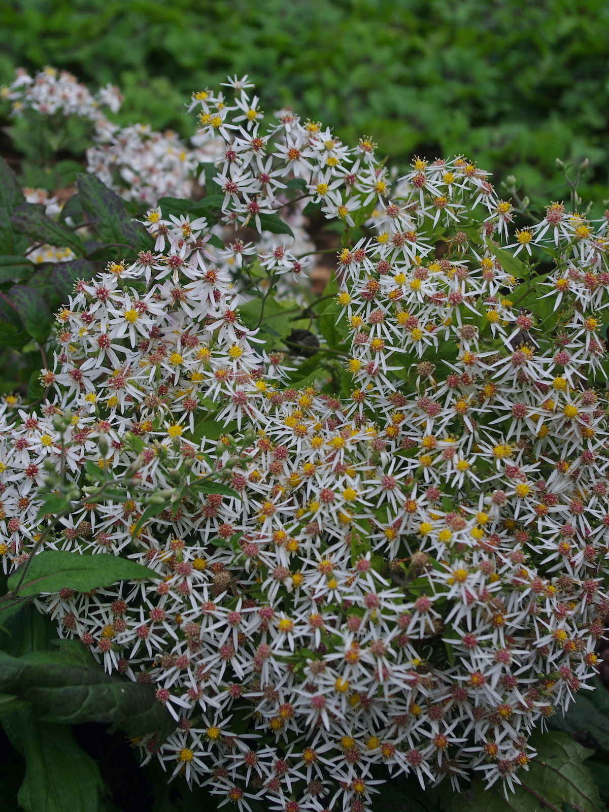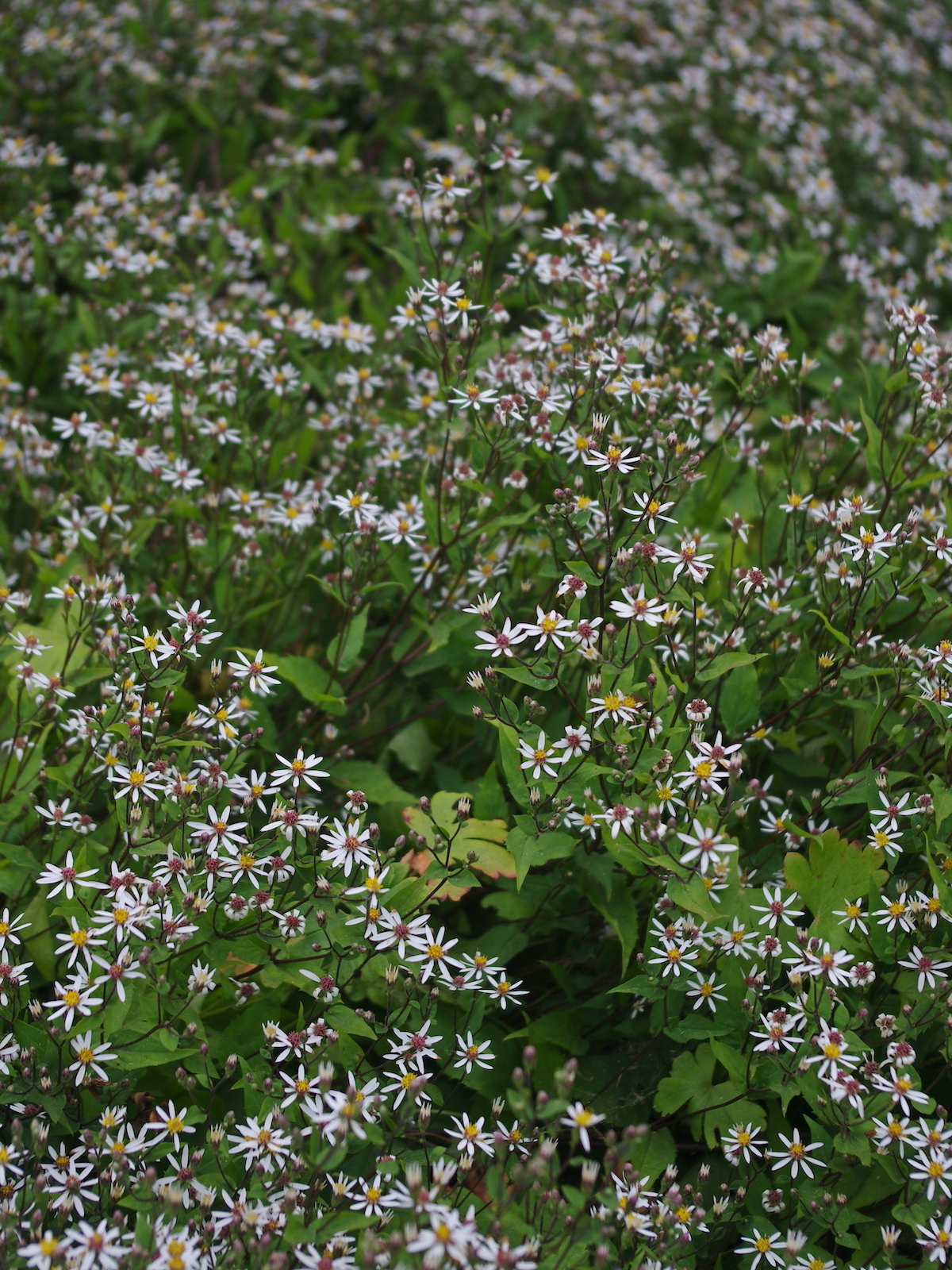 Gertrude Jekyll showed us how to plant this among bergenias where its thin, shiny black stems topped with frothy sprays of tiny, white, pink-flushed daisies are supported, adding a change of texture and colour in late summer. This is one of the first michaelmas type daisies to flower, sometimes late summer, flowering through autumn. They can illuminate a shady corner with their masses of white flowers. Synonym Aster divaricatus. Although  around 60cm is its potential height, we find it tends to lean and gently drift through other plants, to around 30-40cm tall.