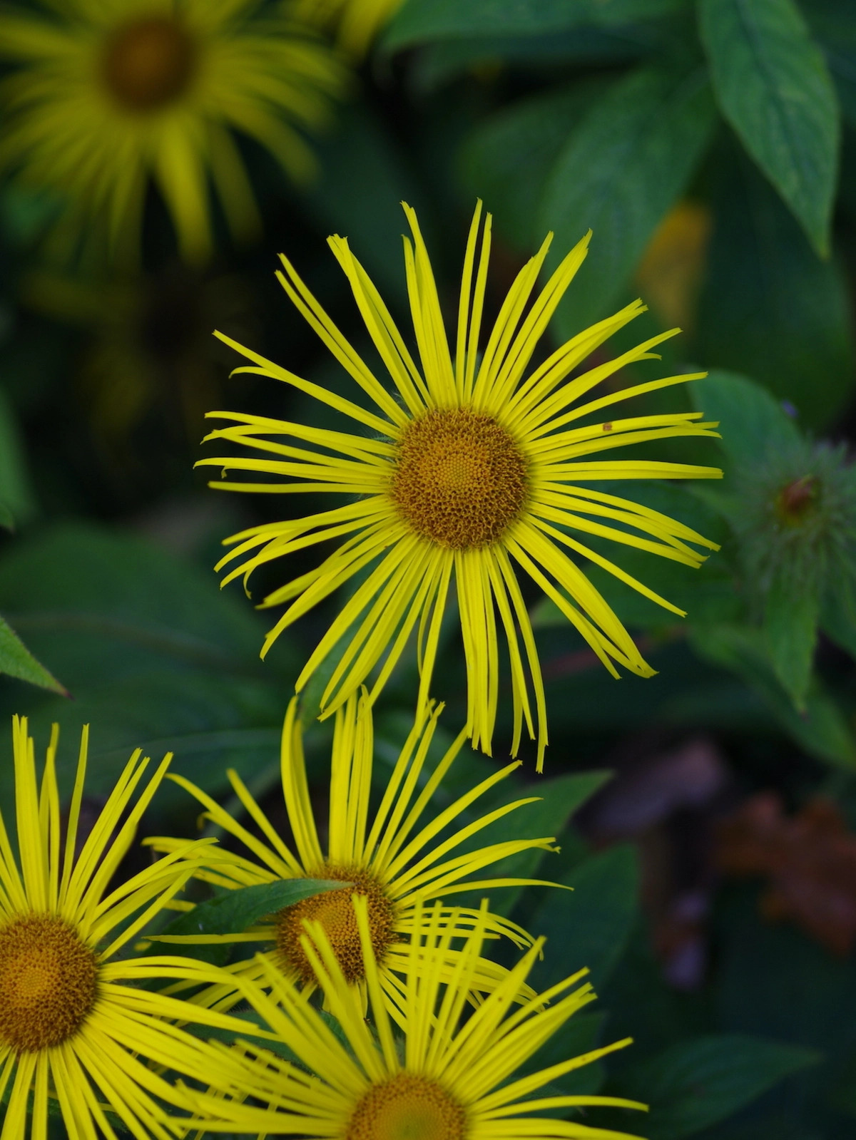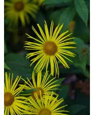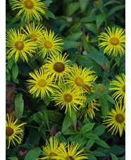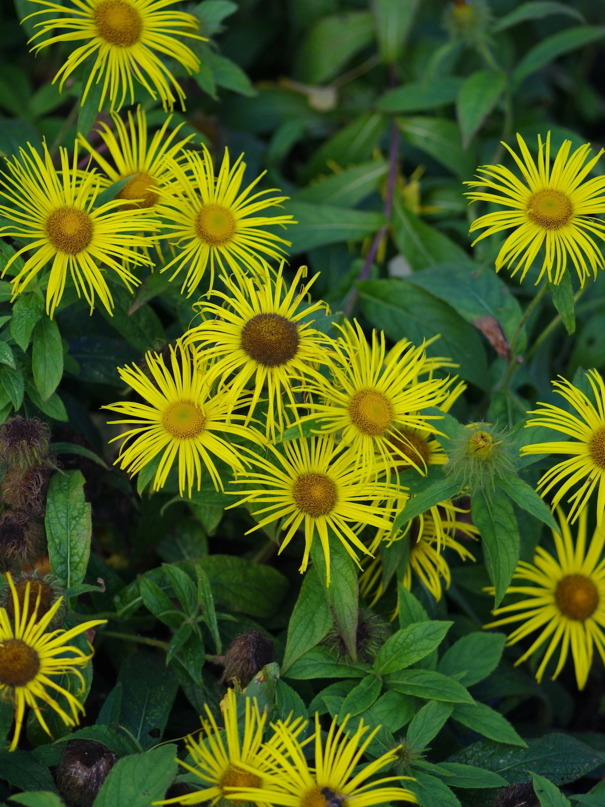Spreading clumps send up leafy stems topped with very attractive furry buds like little birds nests. Each bud seemingly individually designed and arranged. They themselves are worth growing the plant for. They open to yellow, very fine-rayed daisies in late summer. In a drier soil, it will spread less quickly and flower at a lower height. An underrated plant. Adored by butterflies and pictured here with a gatekeeper.