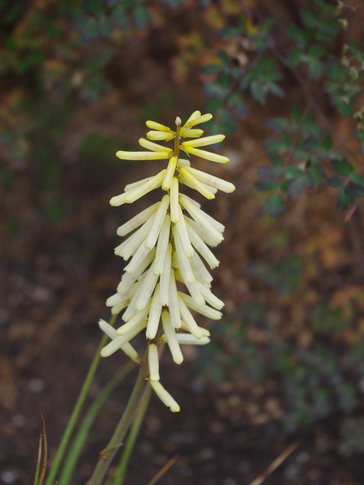 Has neat narrow foliage topped by slender stems closely set with narrow tubular flowers extending more than half-way down the stem. Green in bud, the flowers open ivory white. New flowers produced for weeks in autumn. An original Beth Chatto seedling, from seeds kindly given by Cedric Morris. Previously listed as K. 'Small Maid'.