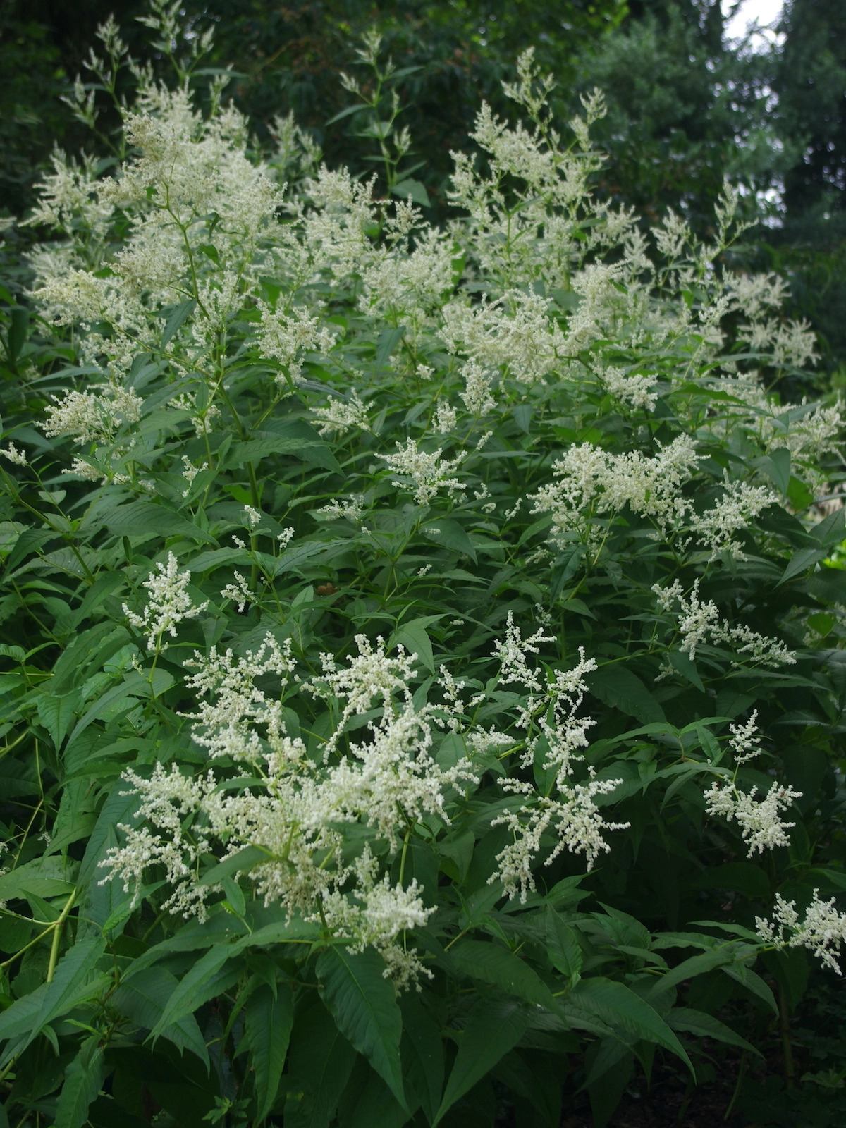 Forms a tall columnar plant, composed of strong stems handsomely clothed in large pointed green leaves, topped, in midsummer with widely branched heads of small creamy-white flowers. Makes an important statement above lower plants, such as hostas, dicentras, ferns and ajugas. By September the flower heads become stained bronze-pink and green. For deep rich soil, sun or part shade, sheltered from wind. Synonym P. polymorpha, P. alpina.