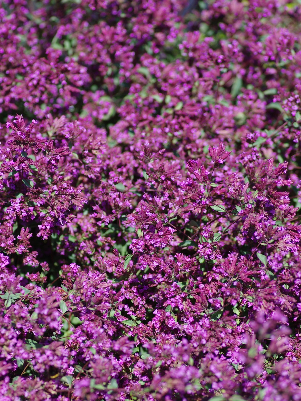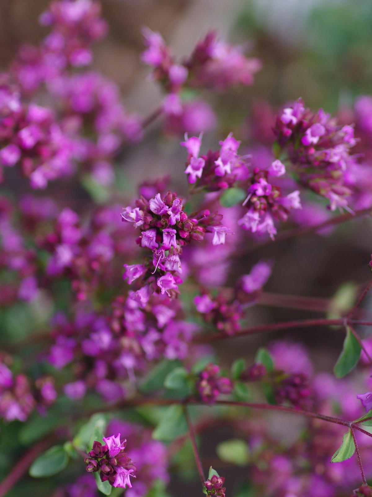 This pretty late-summer plant has small pointed leaves on wiry stems topped with daintier heads of tiny pink flowers held in scaly purple bracts. Both this and O. 'Herrenhausen' plants are handsome additions to edge the dry border with blue grass (festucas) and thyme mats while O. 'Hopleys' is the prettiest to pick.
