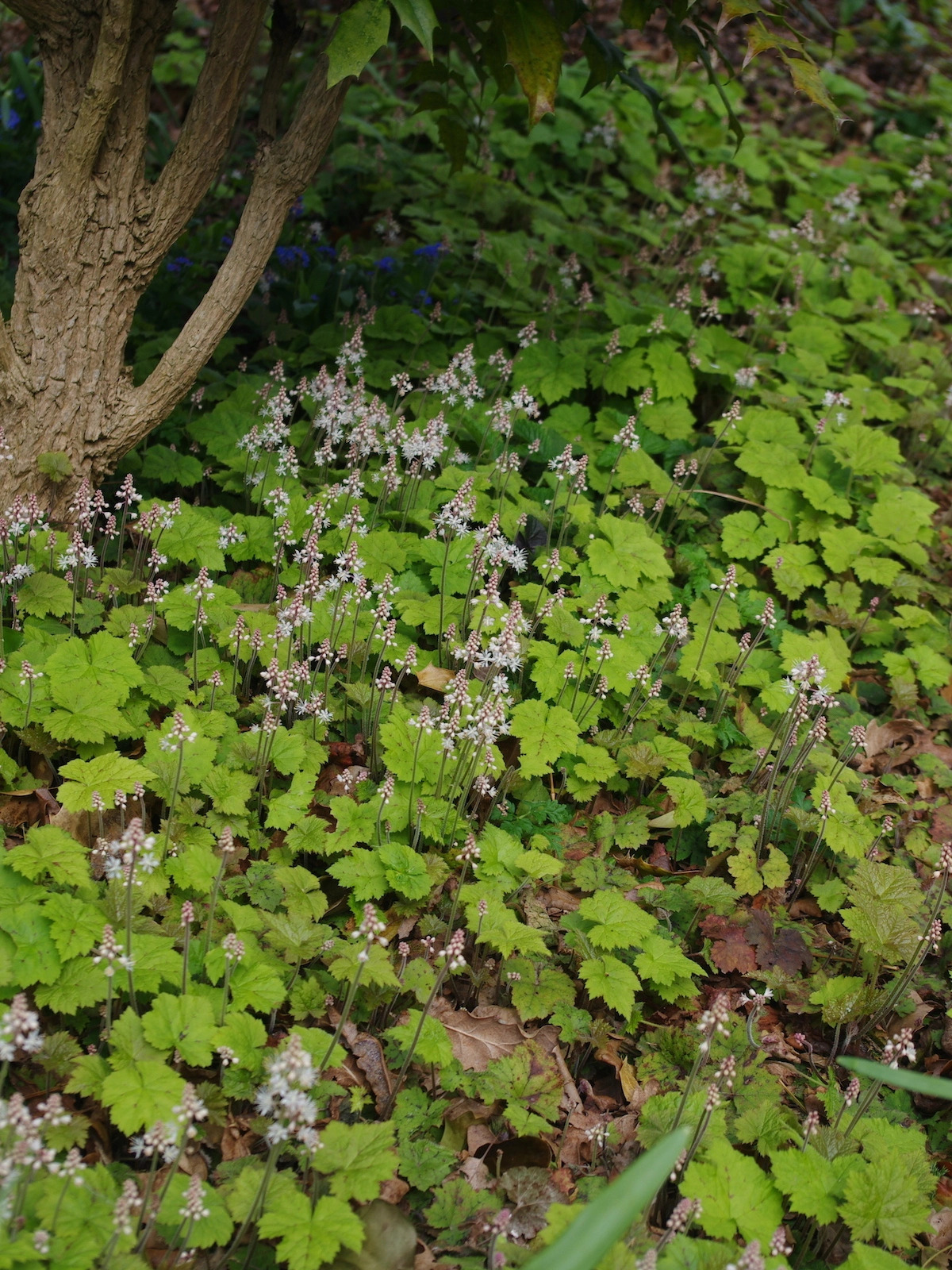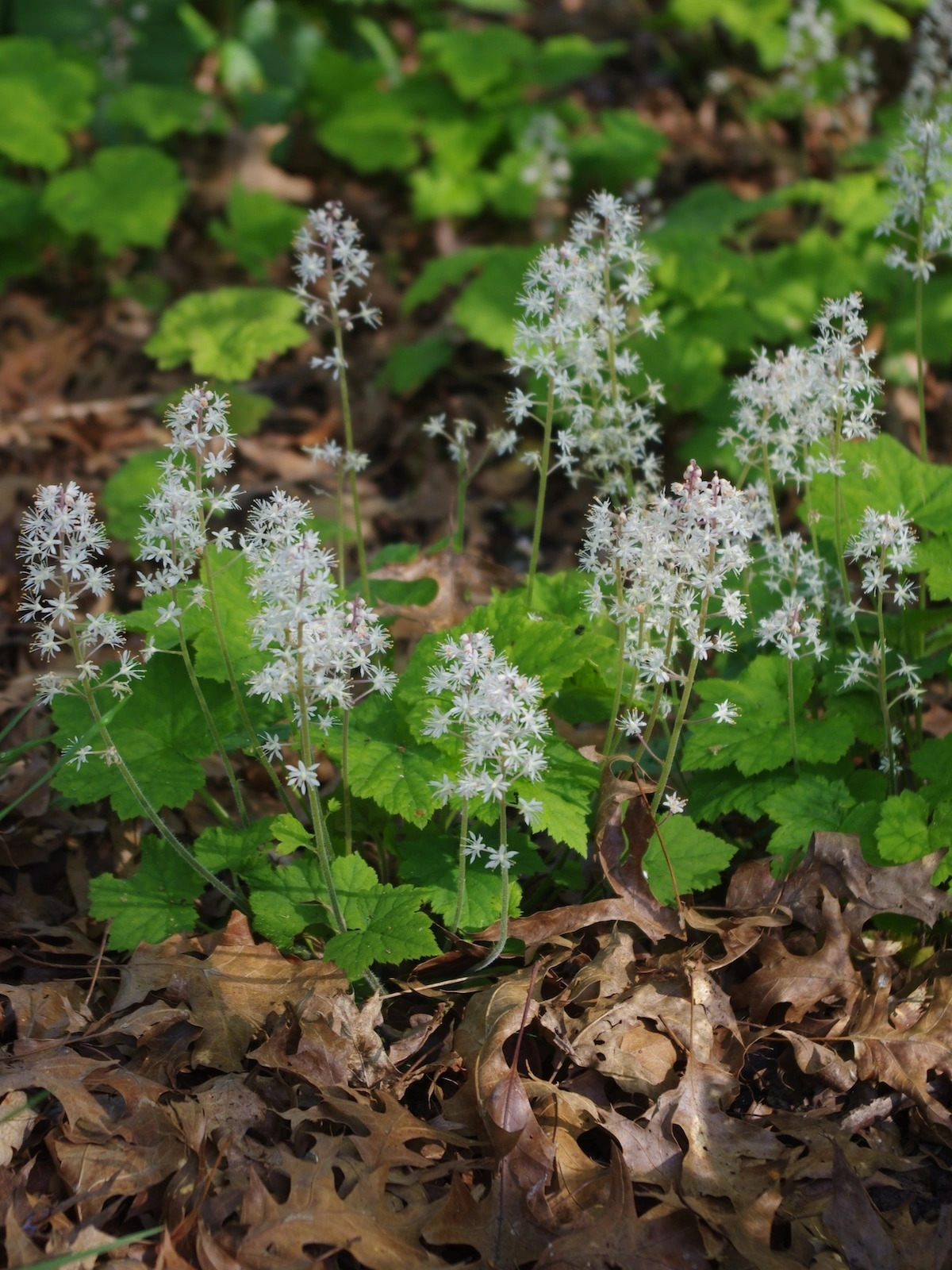 A plant native to damp, wet woodland of eastern North America. Running trails of pretty pointed green leaves form complete almost evergreen cover. In spring a mass of foaming creamy-white flowers spikes. An essential plant to interlink taller shade loving plants. Early summer.