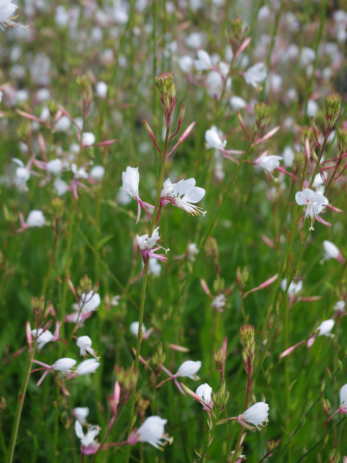 Slightly more lax in habit than Oenothera lindheimeri (synonym Gaura lindheimeri) with leaves which are distinctively wavy-edged. Typically long flowering, the flowers are white ageing pink or sometimes red. Synonym Gaura sinuata.