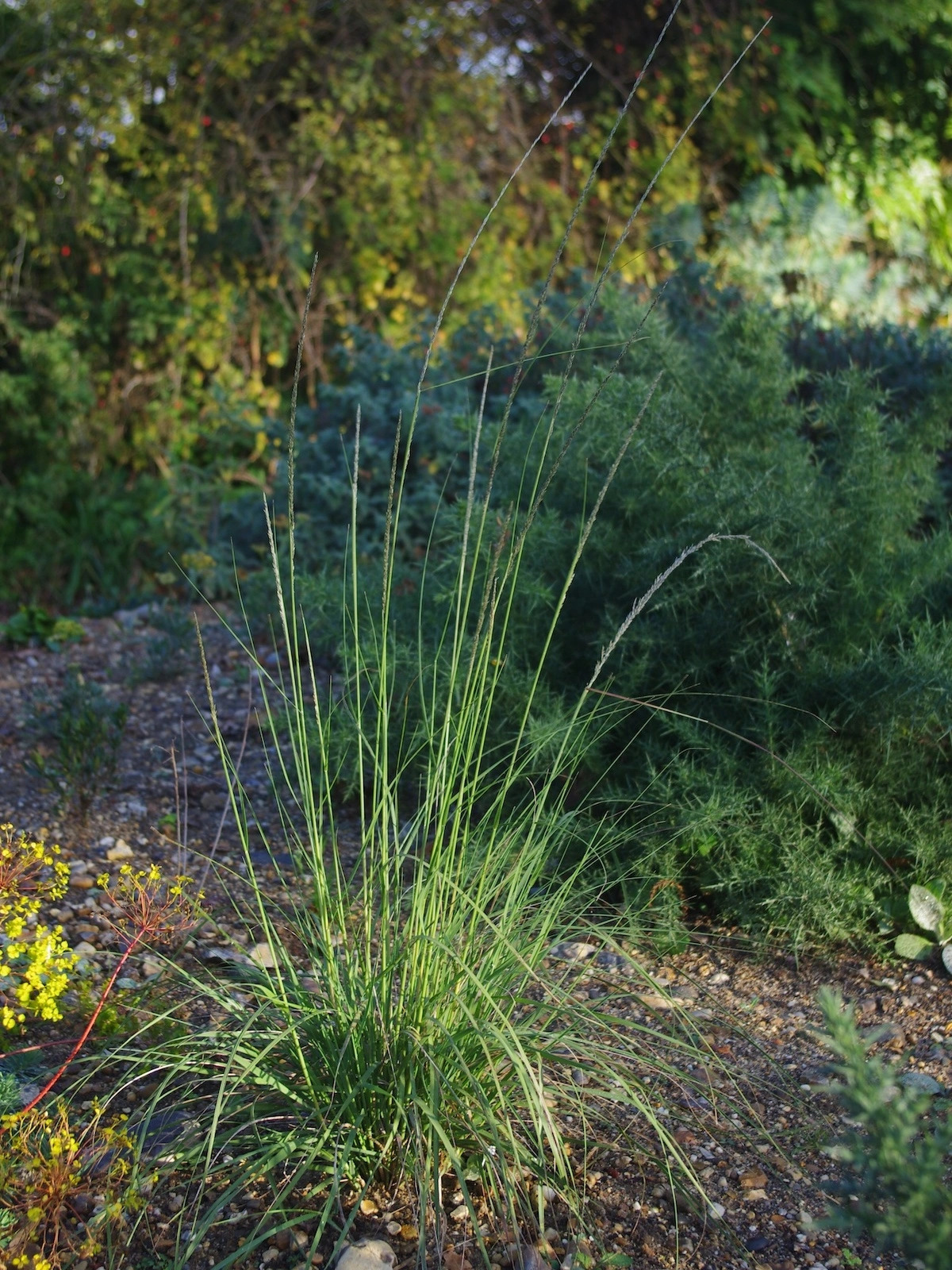 A new grass to us, with potentially excellent drought tolerance. In summer, whip-like flower spikes, have a silvery sheen and gently arch outwards. Similar in effect to Poa labillardierei. Needs full sun and well-drained soil.