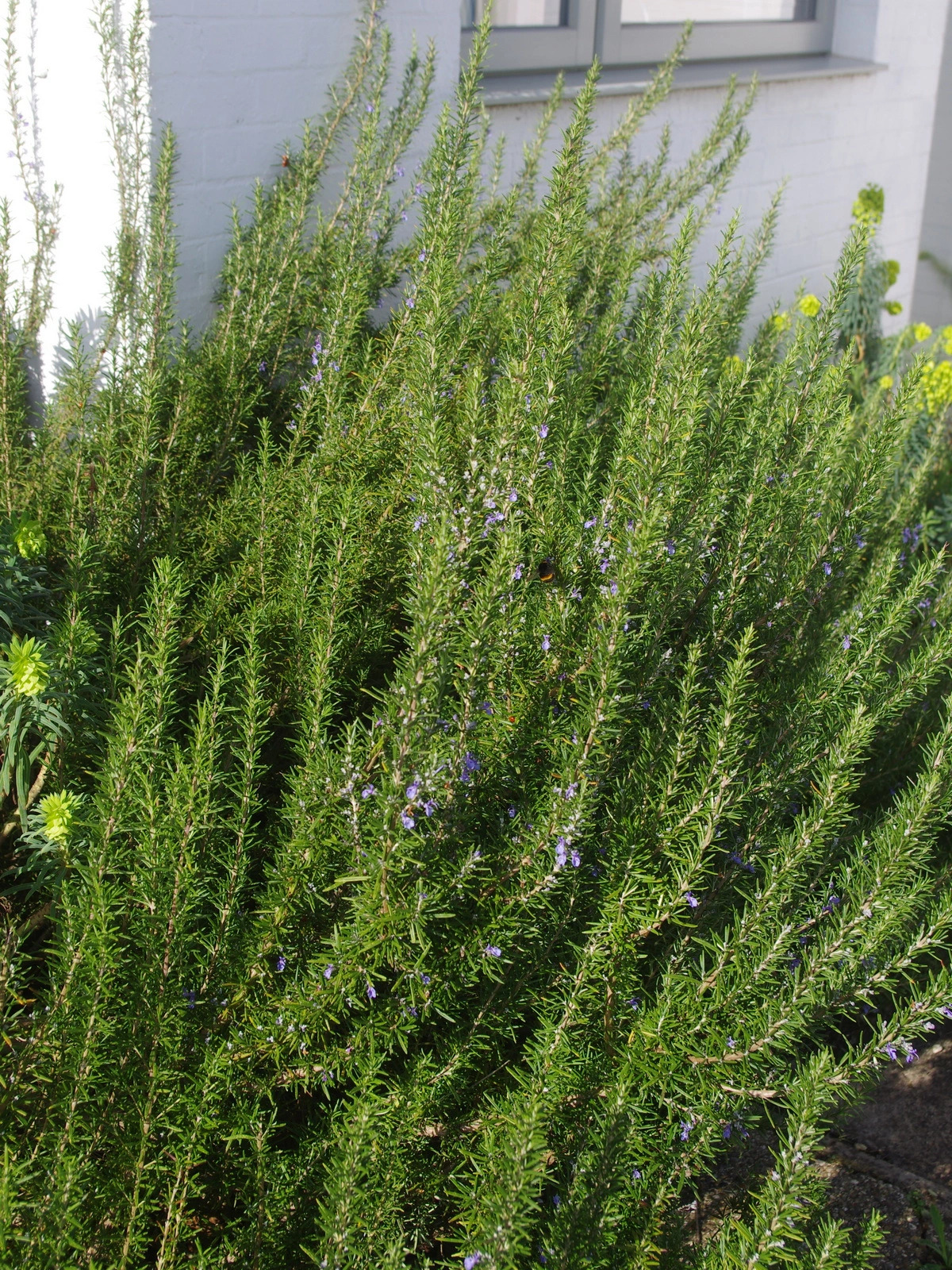 Long established outside Beth's house, an aromatic shrub with leathery, narrow dark green leaves. Pretty pale blue flowers in spring and summer.