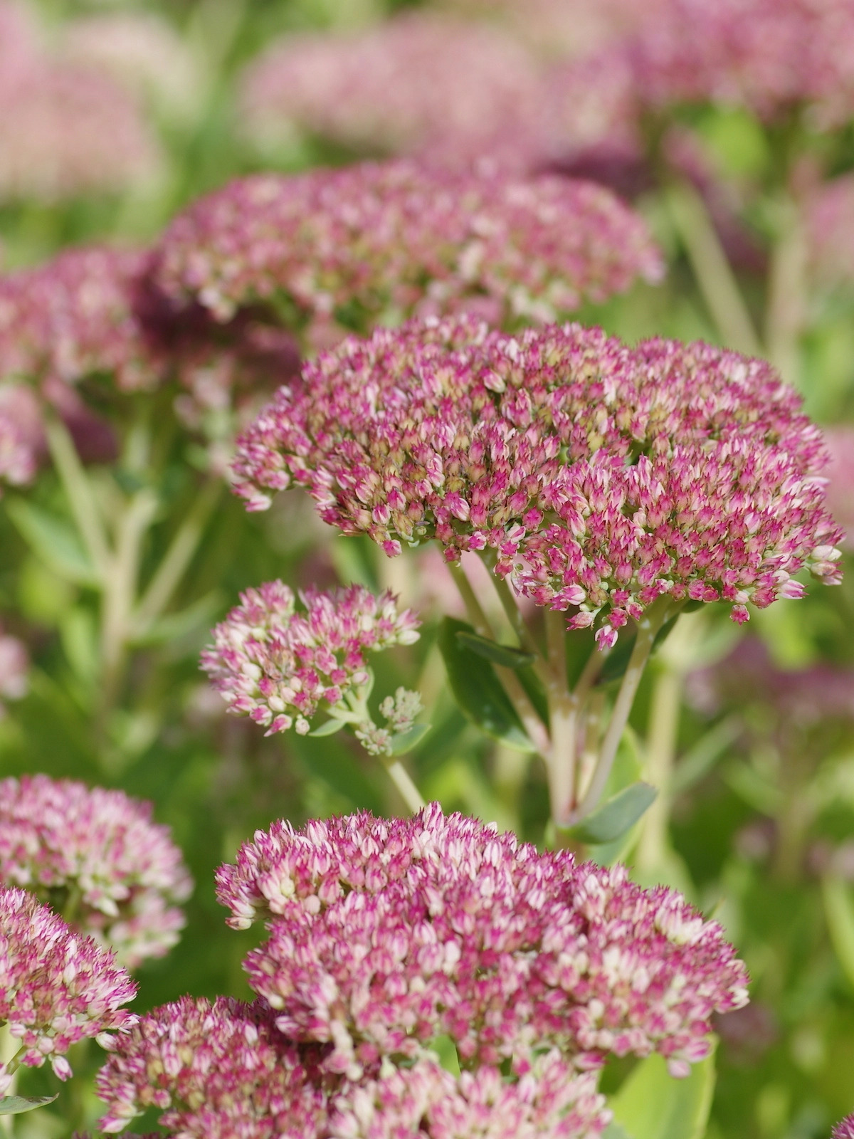 Well known, but still one of the best garden plants, in all stages. First the early rosettes of fleshy slightly toothed grey-green leaves, then large heads of waxy buds exactly the same colour as the leaves, next opening to rich pink starry flowers which deepen to brick red, and finally warm brown seedheads. Crowns need dividing occasionally and the plant benefits from a 'Chelsea chop' annually to produce best results. Bees love this, but butterflies are not so keen. Introduced by Georg Arends in 1955.