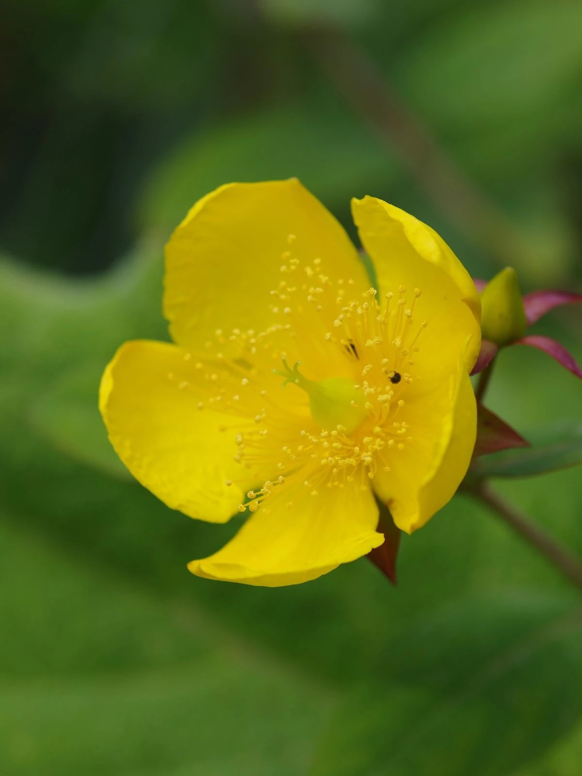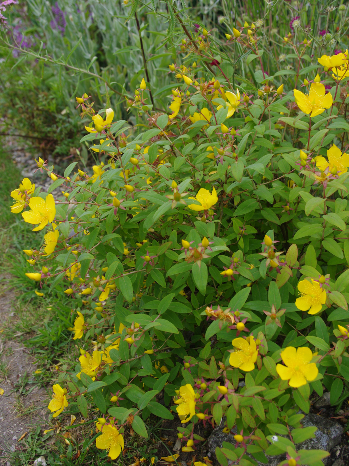 A choice hypericum, with typical large yellow flowers, in summer, but highlighted with a colourful pink-red calyx. Stems and young leaves have good colouration.