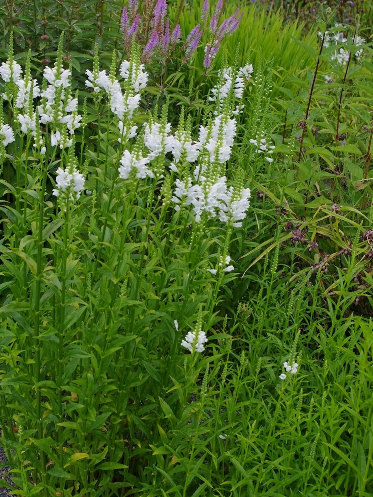 An erect perennial with toothed mid-green leaves and spikes of white flowers.