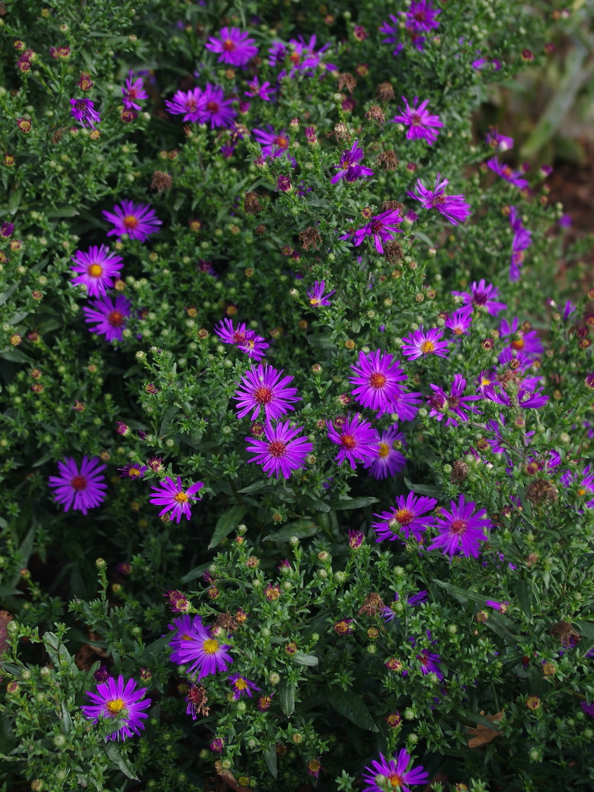 Stunning plant, has dark stems and leaves, then in late summer beautiful violet coloured daisies. Tall and rangy.