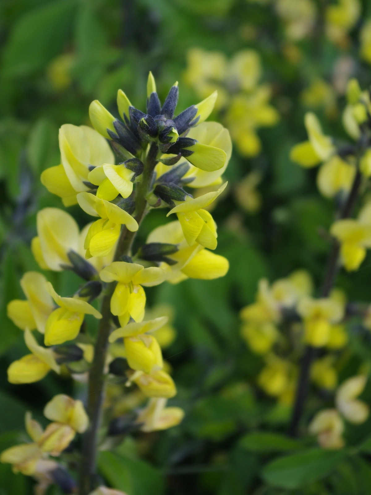 A lupin-like plant found in the wild from Alaska and Siberia so is fully hardy. Almost black, slightly hairy stems carrying narrow heads of pale lemon-yellow pea-flowers held in conspicuous dark green calyces. The stems are clothed in trifoliate leaves. Total effect is very handsome in late spring. This is thriving is an open site in our reservoir garden and is a clump forming species, unlike some which can travel.