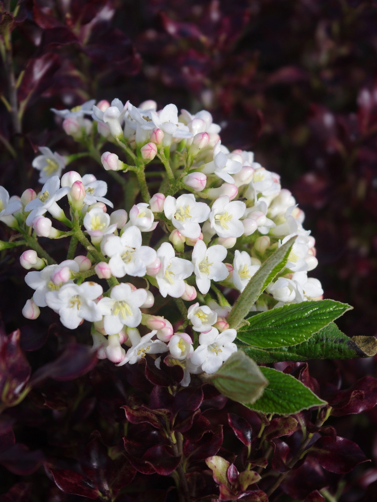 A rounded, evergreen shrub with glossy dark green, ovate leaves and highly fragrant white or pale pink flowers in mid and late spring. A cross of V. carlesii and V. utile by by Burkwood & Skipwith in 1924. Fruits are red, before ripening to black.