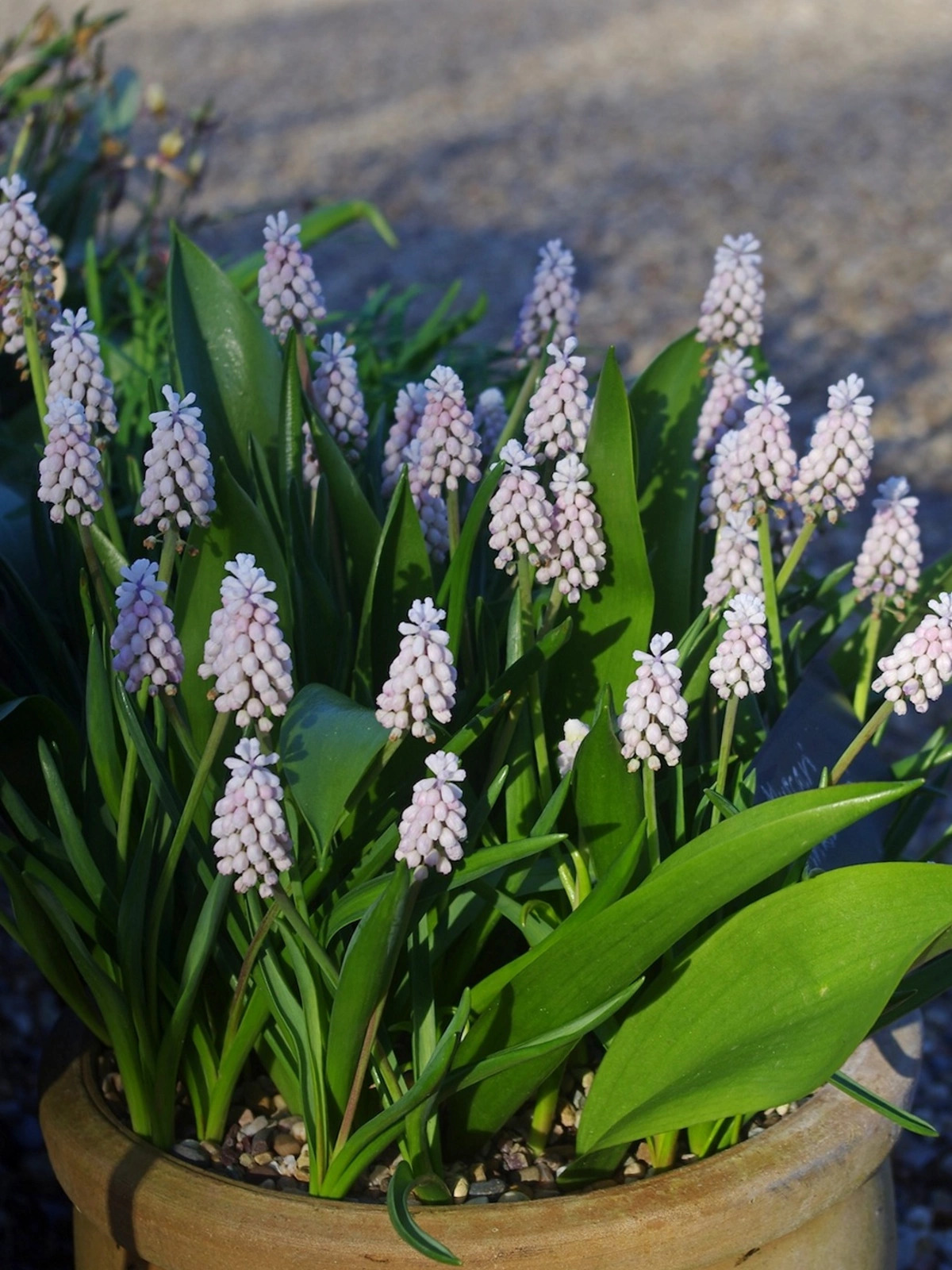 An unusual grape hyacinth, with soft pink flowers, with a hint of icy blue.