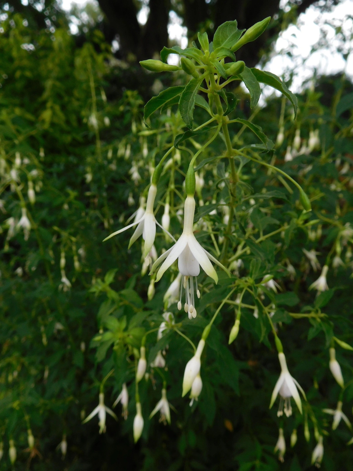 This enchanting form, as amongst small, neat foliage, drip jewel-like, long, narrow ivory-white flowers. The tip of each pointed petal is stained green, like elegant painted finger nails. Prefers a cool site and retentive soil. Introduced by James Travis in 1973 and a hybrid of F. magellanica & F. 'Venus Victrix'.