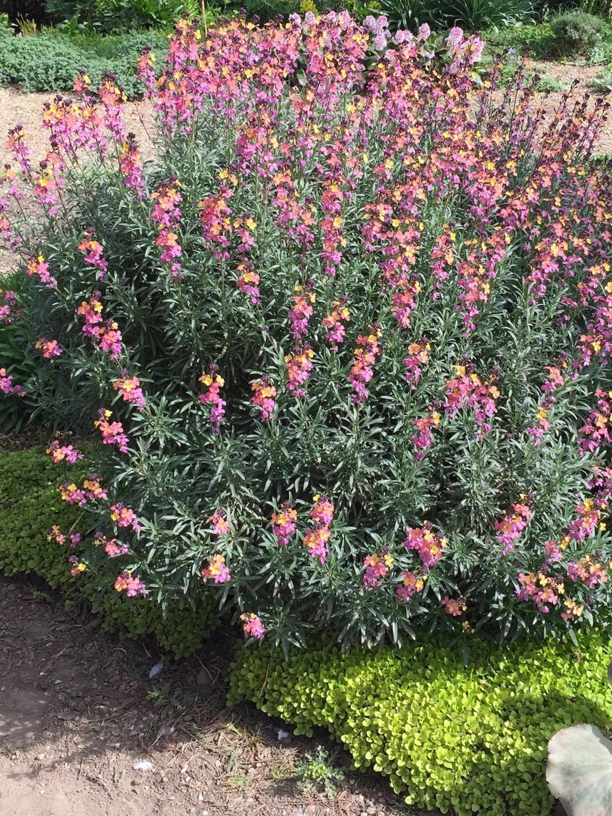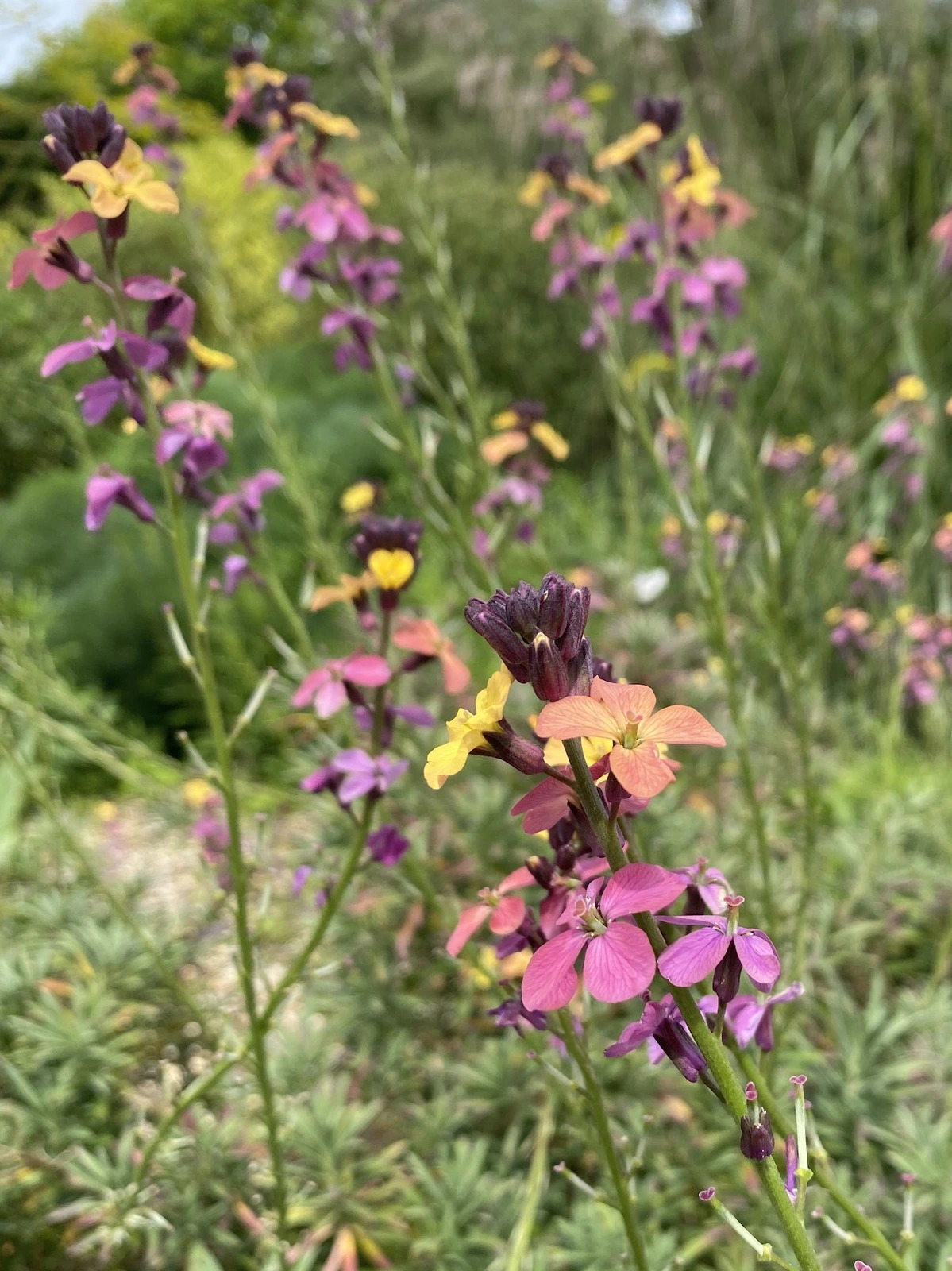 Forms a woody bush carrying long stems of multicoloured flowers. Dark purple buds open creamy-yellow flowers feathered with mauve, each flower becoming entirely mauve with age. Flowers for months, spring into summer.